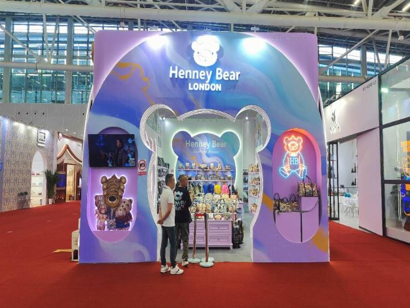 展位功能:基础层板展区满足成品包包的展示需求,欧式烤漆中岛柜突出头部商品,挂架与之呼应,全方位展示展品细节。背板的小熊头雕刻与墙上的喷画风格相呼应,强化品牌形象。休息区设计贴心大气,全方位展示企业的关怀。