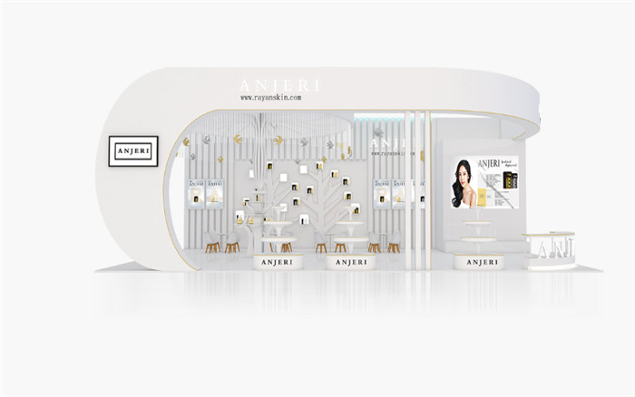 ANJERI的美博会搭建布置中,采用三面开造型设计,主体以白色为主,方便展示企业形象、以及产品信息。使得展台简洁、明亮。