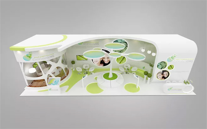 EmiratesLNG本次的展台设计,采用现代风格设计,以白色和绿色相互搭配,加上灯具灯光打照,显得整个展台简洁高端大气清新。