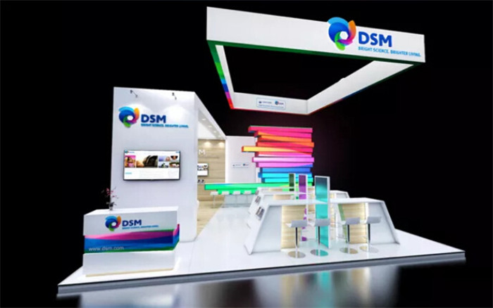 DSM本次广交会展台设计搭建采用三面开口的开放式现代风格设计,搭配上五彩缤纷的颜色的灯箱,衬托出了整个展位的简洁,高端,大气。