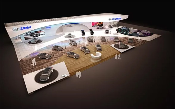 北京现代本次的展台设计采用简约时尚的现代风格设计,以高端的白色为主色调,加上LOGO的蓝色设计,显得耀眼夺目。整个展台设计都突现了公司的高端大气的品牌形象。