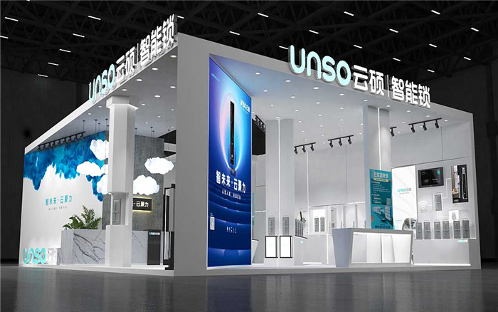 为了更好的契合云硕指纹锁的品牌形象,广州市建材展搭建设计过程中,采用了半开放式造型设计,主体风格为现代风格设计,以白色为主,灰色衬托。展台整体呈现了高端、大气的品牌气派。