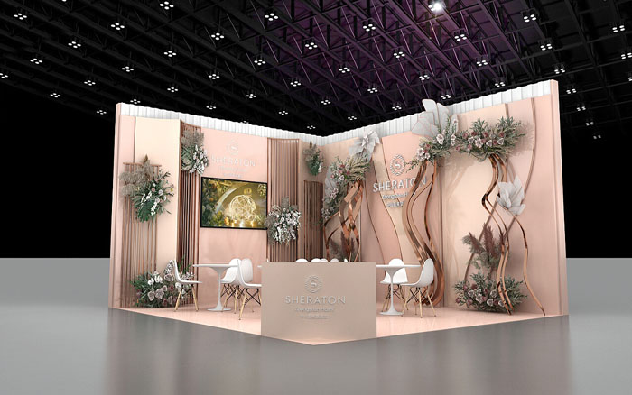 广州婚博会展位设计中山喜来登酒店先用了粉色设计,加上花朵与线条的衬托,展现出了婚礼的浪漫、甜蜜。