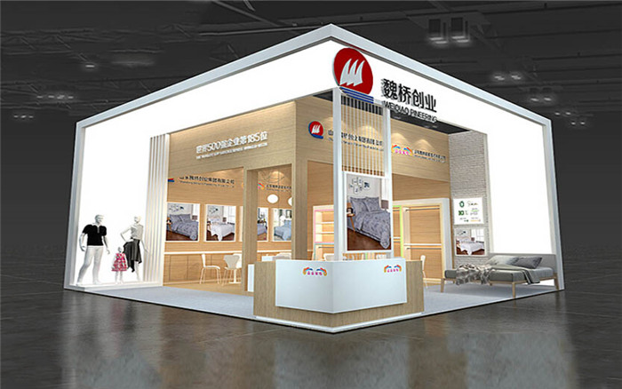 家纺展会搭建中,山东魏桥采用现代风格设计,把展位分成内外两部分设计,展位外部以展示产品为主,展位内部设计了产品分类展示区与洽谈区。同时,设计独特的展台更具吸睛亮点。