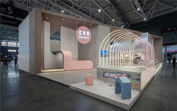 红苹果的家具展位计装修造型以简约感设计,主体色彩以纯色设计为主,主要展示现代家具风格、同时,也体现出高端、舒适的品牌形象。