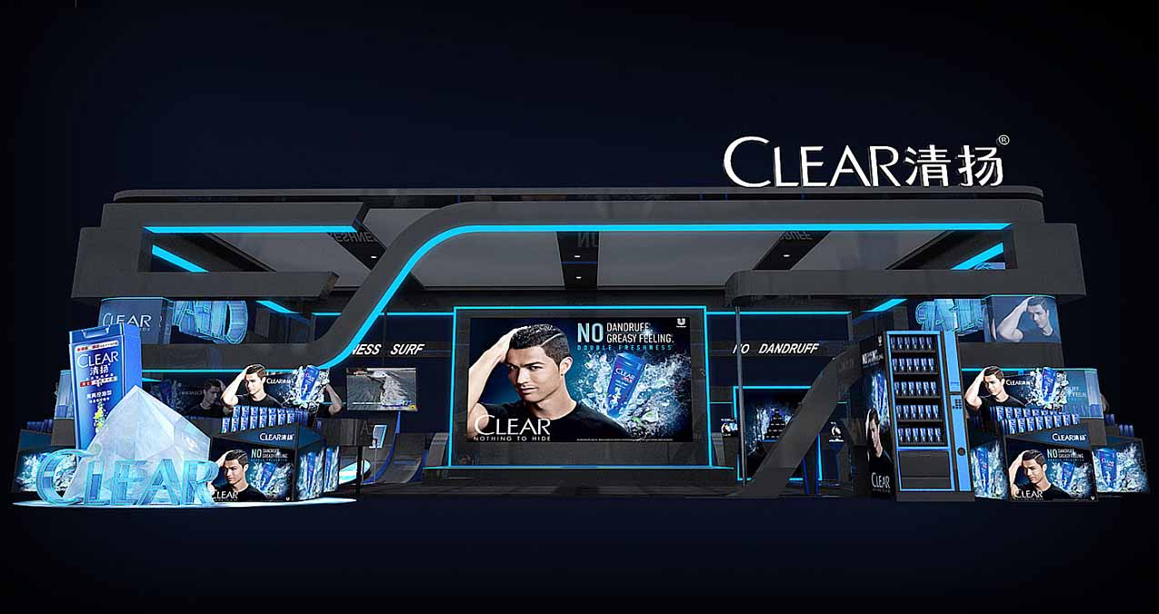 清扬在美博会特装搭建上,采用现代风格设计,主体以深灰色为主,外加蓝色发光布点缀,使用展台展现出沉稳、炫酷的产品形象。同时,展台还利用了LED屏、画面等方法重点展示产品信息宣传。