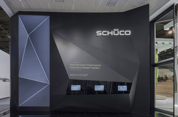 SCHUCO展台主体色彩以白色为主,在企业LOGO展示以黑色背景更能突出企业产品,同时,在展台的设计过程中,也有独特的设计部分。
