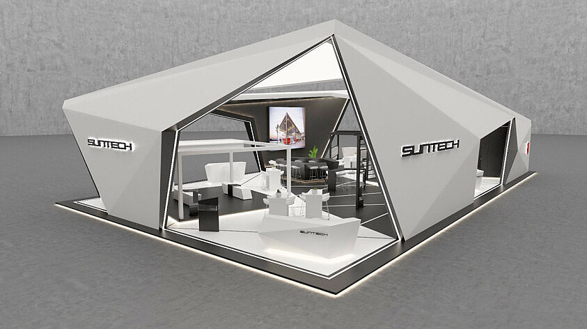 SUNTECH本次的新能源展会搭建,采用了现代半开放式设计,造型以“不规则的几何图形”设计,主体以白色为主,黑色辅助搭配。展台整体展示出了时尚、科技、高端的大品牌形象。