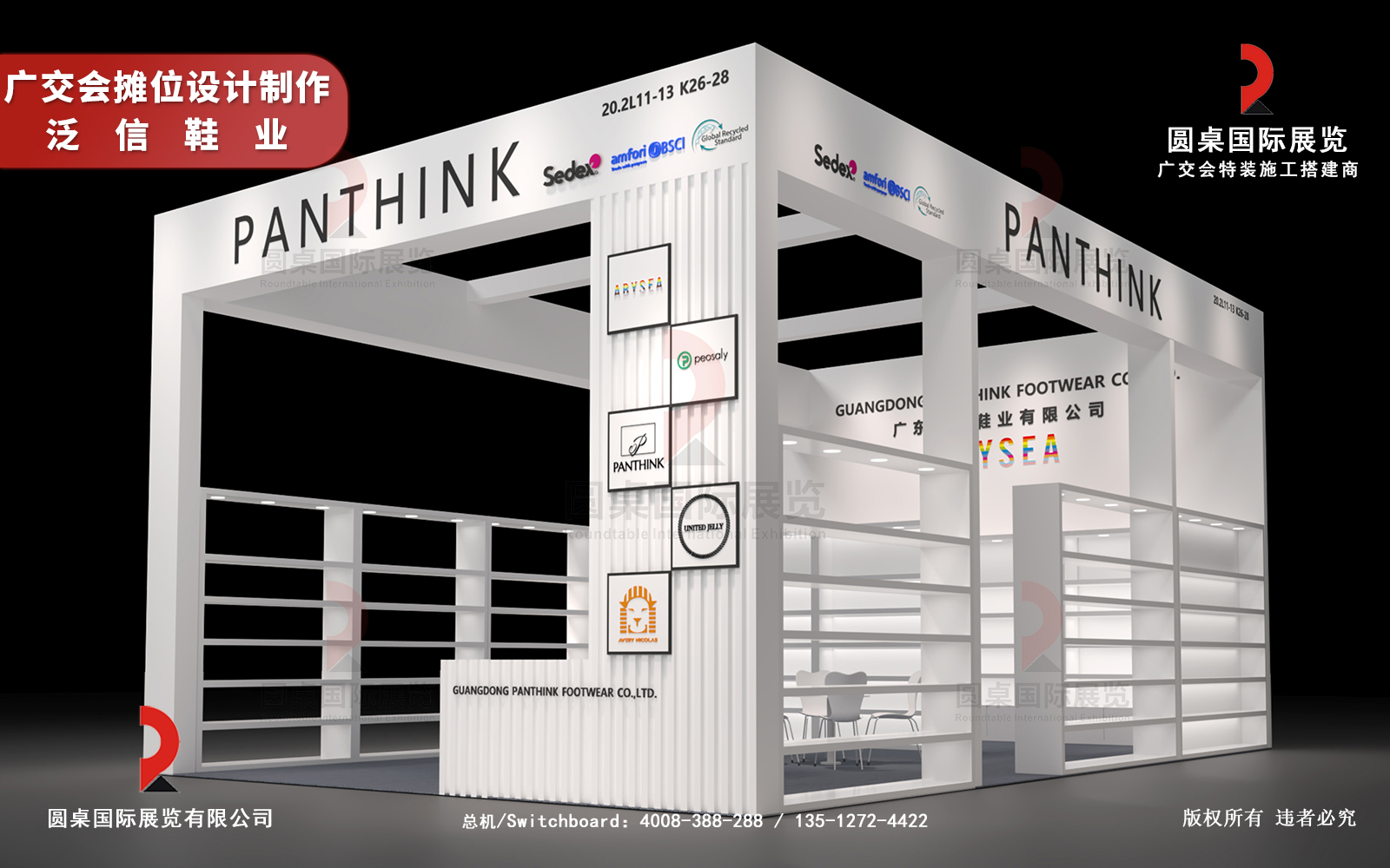 广交会摊位设计制作公司【圆桌国际展览有限公司】为【广东泛信鞋业有限公司】提供专业的广交会摊位设计装修、广交会展台搭建、广交会展会制作、广交会展位布置和广交会会展策划等服务,圆桌国际展览拥有广交会展经验十足的设计制作团队,精良的工程技术,拥有10000多平米的展览制作工厂,圆桌愿为大家的品牌发展贡献我们的专业经验!